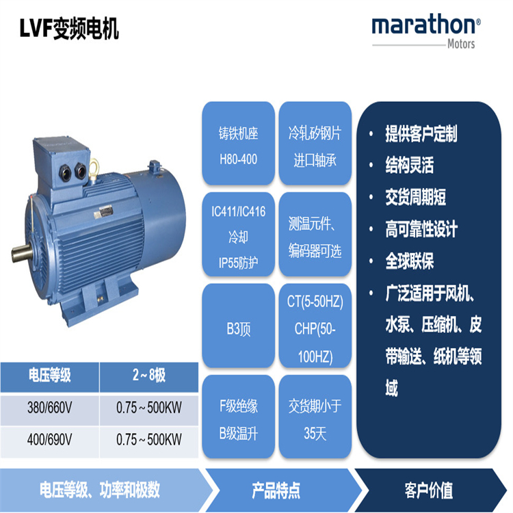马拉松DE4开启式电机(IE4)标����� �������Ƴ������������ �������Ƴ������������ �������Ƴ������������ �������Ƴ�������准:IEC效率指标:IE4机座范围:160����� �������Ƴ����������� �������Ƴ����������� �������Ƴ������������ �������Ƴ�������~355机座功率范围:15~����� �������Ƴ������������ �������Ƴ����������� �������Ƴ������������ �������Ƴ�������630KW电压:220/380V ����� �������Ƴ������������ �������Ƴ������������ �������Ƴ������������ �������Ƴ�������380/660V频率:50Hz极数:2P����� �������Ƴ������������ �������Ƴ������������ �������Ƴ����������� �������Ƴ������� 4P 6P防护等级:IP23����� �������Ƴ������������ �������Ƴ������������ �������Ƴ������������ �������Ƴ�������绝缘/温升等级:F级绝缘,B级升����� �������Ƴ������������ �������Ƴ������������ �������Ƴ������������ �������Ƴ�������服务系数:标配SF1.0,可定制轴承:SK����� �������Ƴ������������ �������Ƴ������������ �������Ƴ������������ �������Ƴ������F 或 FAG安装方式:B3、B5、B3����� �������Ƴ������������ �������Ƴ������������ �������Ƴ������������ �������Ƴ�������5、V1冷却方式:IC01表面颜色:RA����� �������Ƴ������������ �������Ƴ������������ �������Ƴ������������ �������Ƴ�������L5008绕组温度保护:可选配����� �������Ƴ������������ �������Ƴ������������ �������Ƴ������������ �������Ƴ������PT100轴承温度保护:����� �������Ƴ������������ �������Ƴ������������ �������Ƴ����������� �������Ƴ�������可选配PT100主要应用����� �������Ƴ������������ �������Ƴ������������ �������Ƴ������������ �������Ƴ������:纸机主传动、风机、水泵、压缩机等通用机����� �������Ƴ������������ �������Ƴ������������ �������Ƴ������������ �������Ƴ�������械设备LVF2变频电机(IE2)